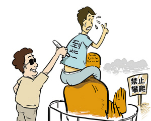 第二例,陜西李文春攀爬紅軍雕塑照相案。照片被微信傳出后,引起公眾的譴責。國家旅游局立即進行督辦,陜西省旅游局已將李文春已并列入“游客不文明行為記錄”。吳起縣勝利山景區因管理不嚴,被取消年度評先評優資格。國家旅游局研究決定:⑴將李文春列入“全國游客不文明行為記錄”,期限10年;⑵吳起縣勝利山景區因管理不善,兩年內不得參評A級景區。