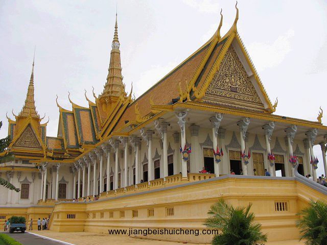王宮是一組金色屋頂、黃墻環繞的建筑,包括曾查雅殿、金殿、銀殿、舞樂殿、寶物殿等大小宮殿20多座,回廊上是仿吳哥寺的浮雕。曾查雅殿雕梁畫棟,琉璃瓦頂,同左側金光閃爍的波列莫羅科特佛塔交相呼應,景色壯觀。金殿內有寶物殿,專門陳列珍寶。在王宮的所有建筑中,銀宮最為華麗,地面用4700多塊鏤花銀磚鋪就。大殿內供奉著高約60厘米,由整塊翡翠雕成的佛像,晶瑩剔透,是柬埔寨的瑰寶,所以又將銀宮稱為綠玉寺。銀宮內還有用純金鑄成的大小兩尊佛像。