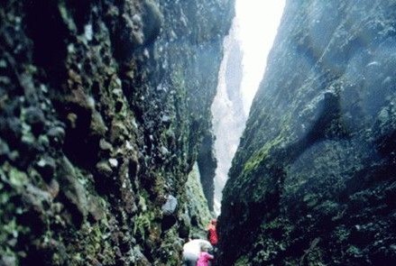 一閘險一閘,閘閘景不同。水井入谷口處,為“一道閘”。南北山崖壁立,谷底難容一足,眼前是一層樓高的“天梯”通道。出了“一道閘”,抬頭仰望南面半山崖有一處月牙形的龐然大洞;拾級而上,一個能容千人的石洞,常年干爽明亮、冬暖夏涼,這里被人們稱為“石窟王宮”。進入“二道閘”,它比起“一道閘”更加窄長、更加險峻。剛才是陽光明媚,轉眼間便是天昏地暗。抬頭便可望見兩崖?lián)翁欤闶侵摹耙痪€天”景觀。天設地造,極其美妙。在閘內可以看見南面懸崖上飛濺出一道高約50米、寬5米的“水簾”,似乎向攀巖者彈奏出歡快的迎賓曲。“三道閘”上下約有三層樓高,人們無處落腳,比黃山的“鯽魚背”更險一籌。身后是萬丈深淵,腳下峭壁陰森,穿過小水潭,隱約能看到懸崖峭壁之間有一條縫隙,其名“地縫”,循著人工開鑿的石凹,手腳并用往上攀爬,進入谷內,有一種豁然開朗的感覺,攀上谷口時,不妨回頭細看兩石壁上閘痕清晰可辨,谷內就是古時的避王巖。