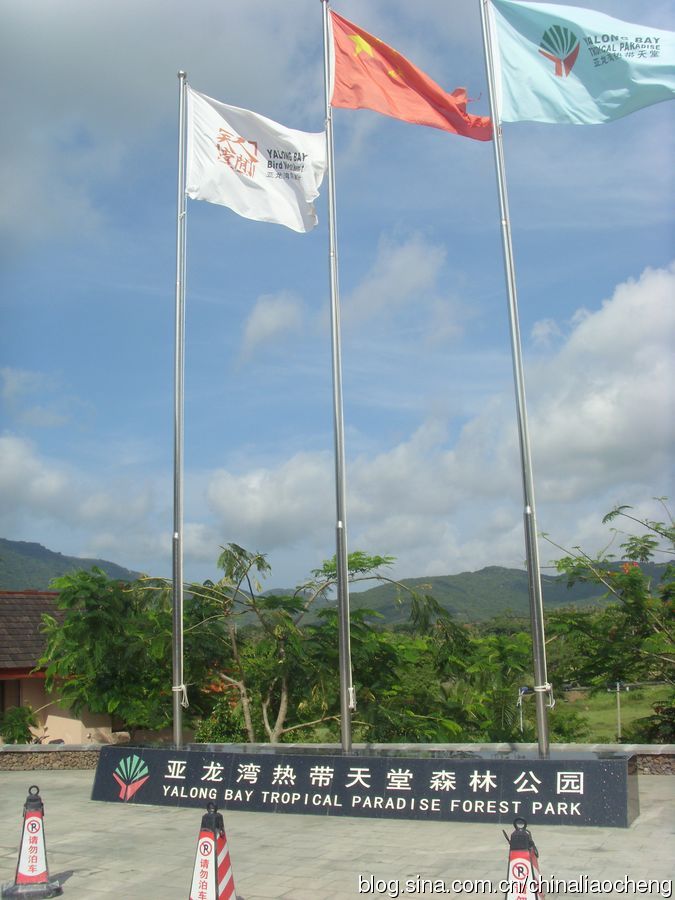 經(jīng)過一番跋涉,終于到達了亞龍灣熱帶天堂森林公園???,五星紅旗隨風飄揚顯得多么奪目啊。