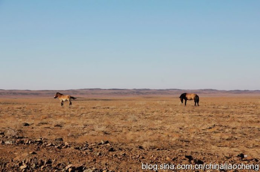 遙望遠處,兩匹野馬在一望無垠的曠野上悠閑的吃草···國寶啊!