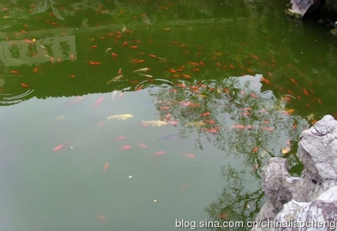 水中綠色倒映,五顏六色的魚(yú)自由自在地游來(lái)游去,顯得真是活潑可愛(ài)啊