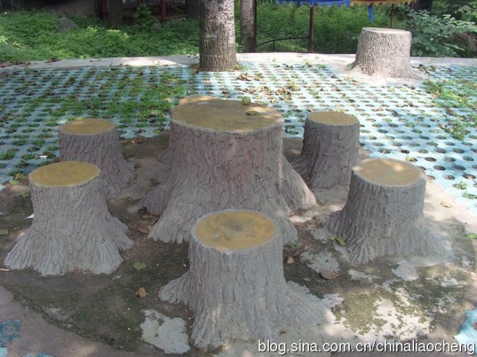 這是用樹墩制作而成的桌椅,顯得很奇異,顯得讓人有一種回歸自然的感覺