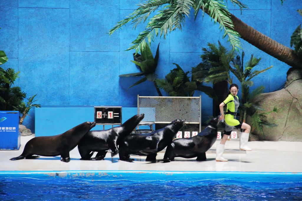 在海洋劇場里有幽默滑稽的海獅表演和浪漫刺激的海豚表演,上演八頭海豚同臺演出、浪漫騎士、激情沖浪、呼啦圈大賽、尾鰭拍球送大禮、高空頂球、人豚共舞、海獅搶凳子、海獅算數(shù)、海獅排球賽、海獅音樂會、海獅空中360°翻轉(zhuǎn)等令游客歡欣雀躍的精彩表演。