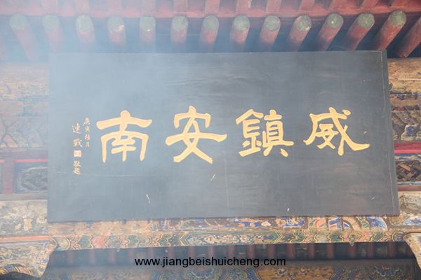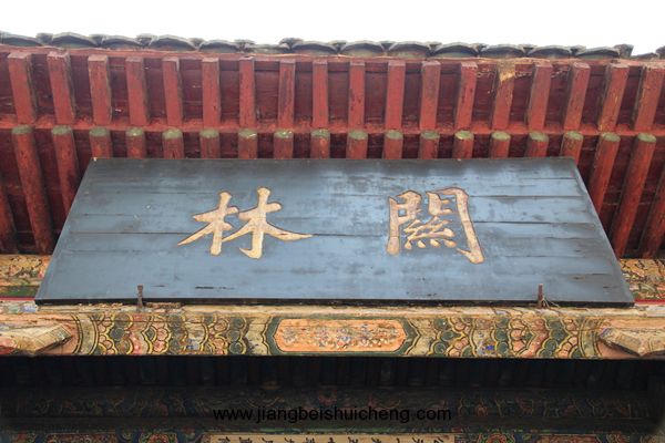 仰面觀之,有一塊大匾高高懸在大門上,上書“聲靈于鑠”四個大字,寓意關公美好的聲名象美好的音樂一樣傳揚四方。這塊匾是清乾隆十五年乾隆帝所題,同時兩側并題有聯(lián)曰:“翊漢表神功龍門并峻,扶綱伸浩氣伊水同流。”由此可以看出,不僅百姓敬仰關公,古代帝王對關公也同樣尊崇。