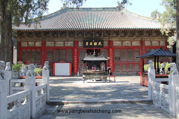 關林二殿,五開間,廡殿式,門上懸掛著"光昭日月"匾額,是清光緒帝御題。殿中塑關羽怒視東吳像,左側站著手棒大印的關平、右側站著手持大刀的周倉。二殿左右各建有一座硬山式的陪殿,左為張候殿,右為五虎殿。三殿硬山式,面闊五間,規(guī)模較小,內塑關羽夜讀春秋像、關羽出行圖和睡像,故又稱寢殿。
