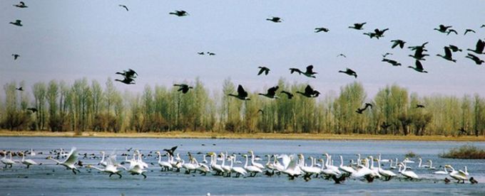再往前走,不遠處,就是候鳥放飛基地了。大學時期,有個朋友說,東北是天鵝的聚集地,那里的天鵝潔白美麗,總是拍打著健美的翅膀,在夜幕來臨時,向著夕陽飛翔,好像是圣潔的精靈。我喜歡天鵝,也憧憬著有一日能一睹她們的風采,沒想到,今天我就有幸和她們來了一次親密接觸。當體態優美的天鵝在我眼前騰空而起時,天空仿佛變成了一個大舞臺,而天鵝,則用雙翅,在這一幅幅壯麗的自然畫卷中,留下了自己來過的痕跡。