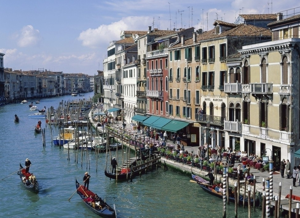 威尼斯肥沃的沖積土質(zhì),就地而取材的石塊,加上用鄰近內(nèi)陸的木頭做的小船往來其間;在淤泥中,在水上先祖?zhèn)兘ㄆ鹆送崴埂_@個不到8平方公里的城市,卻被一百多條蛛網(wǎng)般密布的運河割成一百多座小島,島與島之間只憑各式橋梁錯落連接,初來乍到很快便會迷失在這座“水城”中,找不到路。好在有大運河呈S形貫穿整個城市。沿著這條號稱“威尼斯最長的街道”,可以飽覽威尼斯的精華而不用擔(dān)心迷路。沿岸的近200棟宮殿、豪宅和七座教堂,多半建于14至16世紀(jì),有拜占庭風(fēng)格、哥特風(fēng)格、巴洛克風(fēng)格、威尼斯式等等,所有的建筑地基都淹沒在水中,看起來就像水中升起的一座藝術(shù)長廊。平日里大運河真的像一條熙熙攘攘的大街一樣,各式船只往來穿梭其上,最別致的當(dāng)然還是貢多拉。