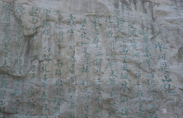 《水泊梁山記》是著名書畫大師范曾2002年專為水泊梁山風景區撰寫。先生懷著對英雄故里的一腔深情,慷慨揮毫、步其先人范仲淹《岳陽樓記》韻,全文368字,描述了水泊梁山河岳闊峻、草木蕭森的雄奇景象。《水泊梁山記》大型摩崖石刻,通高7米、長14米,距地面10余米,單字最大55厘米見方,最小字30厘米見方,通篇368字占地近100平方米,氣勢恢弘、蔚為大觀,形成了南有《岳陽樓記》、北有《水泊梁山記》的文化格局。為旅游勝地水泊梁山再添景觀,現為水泊梁山風景區的主要景點之一。與梁山粗獷豪放的山體及周圍環境交融,深化了景區的水滸文化內涵,成為進入梁山風景區山寨景區的標志性景觀,其所在廣場,亦成為在梁山舉行的與水滸、旅游有關的大型集會的場所之一。