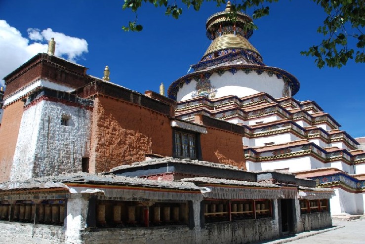 凈室門口兩側還供有四大天王泥塑像。最后部是佛殿,內2柱,無柱礎,面積23。5平方米。大柱表面用麻繩纏繞之后又用2~3厘米的泥皮涂抹,可能是防腐、防火的措施。柱頭雕有蓮花寶座,柱頭小栱上則無裝飾,具有明顯的早期特點。四壁的壁畫多為線描盤腿坐形象,筆法流暢生動。大殿的墻壁均用大石塊夾小石片砌成,厚1~1。3米。殿內供有尼泊爾墀尊公主帶來的銅鎏金不動金剛佛和八大隨佛弟子泥塑像,以及兩大忿怒力士、宗喀巴塑像。佛殿后部和兩側還繞以密閉回廓,偏窄、較高,具有早期布局特征。神殿第二層前前為僧舍,中部為大經堂天井,天井之后為供佛大殿,6柱,內供桑杰魯王甲后、十六尊者及經書;里面還有一大殿,8柱,內供藥師八如來和《甘珠爾》佛典,北面供奉有救度母及其他佛像。神殿第三層前面為達賴喇嘛到該寺的專用住房,共6間。后部則為金頂殿,殿門向東,面積約54。5平方米,內有明柱兩排8根,左右開小窗。殿左右及后部有一周狹窄回廓,以木欄相圍。金頂為漢式風格,屬歇山式,以斗栱承托;金頂垂脊末端套有羯摩魚頭,是為套獸。殿內門窗壁畫、柱子等則是藏式風格,體現了藏漢建筑的巧妙結合。