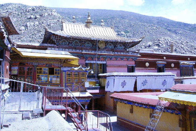 噶舉派本來是個很大的教派,但是由于在薩迦王朝時期一直和薩迦寺不和,雙方最后不惜兵戎相見,戰(zhàn)爭持續(xù)了很長時間。據(jù)說除了派僧兵相互攻殺外,雙方的高僧也在各自的寺院里頻頻做法,依靠法術懾殺對方的人員,后來發(fā)展為雙方的密宗高僧之間的遠距離較量,各種詭異的招法層出不窮,各遣神鬼從在上到地上打得亂成一團。在兩邊各折損了一名主要高僧之后,1290年薩迦寺終于舉寺奔襲千里來和直貢梯寺一決雌雄,這時候雙方的高僧都派不上用場了,改為僧侶之間的肉搏。最終薩迦寺把直貢梯寺殺了個雞犬不留。在雙方的戰(zhàn)爭戰(zhàn)中直貢梯寺的建筑幾乎焚毀殆盡,后來慢慢恢復,寺廟現(xiàn)有僧人300余人。