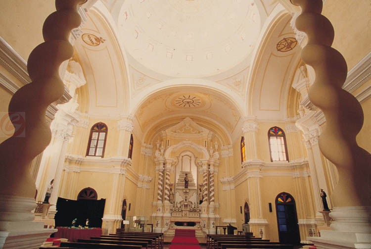 修院圣堂屬巴洛克風格。正面有三個入口,主堂平面成拉丁十字型,長軸長27米,短軸長16米,長軸兩端分別為入口前廳及主祭壇。版權所有山東聊城聊之旅國際旅行社有限公司,轉載必究!祭壇供放其主保(圣若瑟)像,裝飾甚多,其中兩組四枝腰纏金葉的旋柱最具特色,柱頭則以破山花形式收結。而與之呼應的是入口前廳中四枝支撐二樓唱詩臺,來自原圣方濟各修道院的木制盤旋柱。四個拱頂形成一四邊內彎之正方形空間,其上以一羅馬式穹窿封頂,穹窿直徑為12.5米,頂部高度為19米,開有三環各16個窗戶,其中最高一環為假窗,另兩環才具有透風及采光功能,穹頂內側為白色,中間是黃色的耶穌會會的徽。