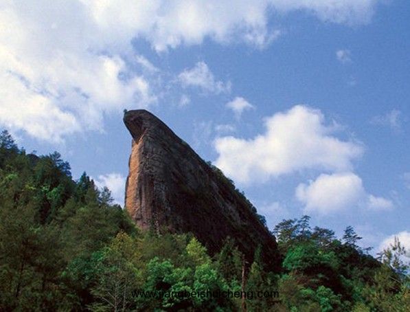 鷹嘴巖位于福建武夷山北天心景區,從古崖居往西行約數百米,便可看見一座形似雄鷹的巨巖。鷹嘴巖是一座渾然一體的巨巖,光禿禿的巖頂,東端向前突出,尖曲如喙,宛如一只展翅欲飛、搏擊長空的雄鷹。尤其是鉤形的“鷹嘴”上生長著一株古老的刺柏,給鷹嘴巖增添了神韻和飄逸,令人驚嘆稱絕。因此,她又被稱為是武夷山最奇特的巖峰。