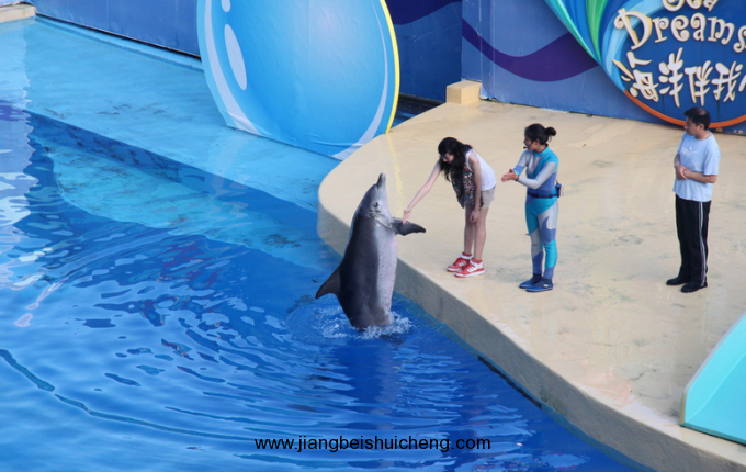 重頭戲——海洋劇場3:30開幕。前來觀看的游客一般會非常多,盡量提前半小時(shí)去,能坐陽光爆曬的座位。節(jié)目內(nèi)容很多,兩只海獅招手、倒立、揮手、拿救生圈救人、對“落水者”進(jìn)行人工呼吸……不知道與海獅kiss是啥味道。五只海豚則表演游泳比賽、跳高觸球、跨藍(lán)、空中翻身36周半、直立旋轉(zhuǎn)、仰泳等,真的是很有靈性。最讓我驚嘆的是那些團(tuán)體動(dòng)作,竟也能做得那樣整齊劃一,有板有眼。