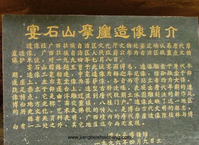 宴石寺正門上書有“宴石寺”三字。它的門聯(lián)和重門聯(lián)為:“宴會群仙地,石開一洞開”、“宴石鐘靈千古秀,仙橋毓秀萬年居”聯(lián)首分別嵌上“宴石”和“宴石仙橋”顯然把宴石寺、宴石山、宴石仙橋三景融為一體。宴石山壁立如削,寺頂平坦,密草叢叢,荊蘿盤生,輕紗般的霧靄在林間回蕩飄逸。版權(quán)所有山東聊城聊之旅國際旅行社有限公司,轉(zhuǎn)載必究!往昔,山頂正中有一泓清泉,波光如鏡,池中五彩斑斕的菩薩魚與藍(lán)天白云相映,恍如神魚遨游蒼穹;山頂清泉從峭壁上飛瀉而下,擊中陡崖的凸處,濺起霧珠,被陽光染成七色彩珠,仿佛為宴石寺石山披上一輪佛光,讓人更添神往。站在宴石山頂向東望去約10公里有雞婆石,它象一個正孵蛋的母雞蹲在雞窩中,在它的背脊上有一個歪著腦袋窺天的“雛雞”,筆者曾爬上過此山,僅用一個手指就算有百十人共同出力,也休想挪開它半寸。向南看,蜿蜒的南流江下游約3公里,在兩處山峽間有一個大平湖,這就是東漢伏波將軍馬援當(dāng)年為平交趾叛亂,動用十萬兵士疏鑿出來的馬門灘。向西看去,巍峨雄偉的云飛樟矗立天極,它的身后就是峰巒疊嶂的六萬大山。向北觀看,遠(yuǎn)處是煙靄籠罩的博白城;中間有一座昂天嘯吼的獅子石山,它口中冉冉騰起熱浪直沖云霄;近處又是丹霞地貌最典型的紫陽冠了,它像一定圓形的禮帽,扣在地表上。在宴石山頂,山風(fēng)習(xí)習(xí),颯氣沐身,環(huán)顧四周,頓覺宴石山成了宇宙的中心,整個乾坤都渺小了。再有江東岸寺西石壁上鐫有神像三尊。摩崖造像雕鑿在離河面約15米的紅砂巖石崖壁上,高三米。中龕坐佛一尊,左右龕為一佛二菩薩。佛像頭部長方形,兩耳垂肩,身披袈裟,袒右肩,結(jié)跏跌坐于束腰式須彌高蓮座上。左右兩龕佛座各辟一小龕,內(nèi)雕獸頭。造像無題記,從雕刻風(fēng)格及其造型、面像、服飾分析,應(yīng)是隋唐或水稍前刻成,自治區(qū)旅游局認(rèn)定是“廣西第一摩崖”,是目前廣西境內(nèi)已知年代最早的摩崖造像之一。摩崖造像地處漢、唐中原交趾(今越南)交通要道南流江畔,為研究我國佛教的發(fā)展和南傳提供了可貴的資料。清道光十二年縣志載,摩崖旁“有臨江巨佛一座,高五十余丈,未窮何年所鑿”。遺憾的是,此巨佛在清末或民國初已倒塌跌落江中,現(xiàn)僅留佛座底裙,尚依稀可辨。
