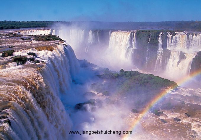 這是南美洲最大的瀑布,世界五大瀑布之一。瀑布呈馬蹄形,寬約4公里,平均落差75米。巨流傾瀉,氣勢磅礴,有如一個大海瀉入深淵。轟轟瀑聲25公里外都可以聽見。