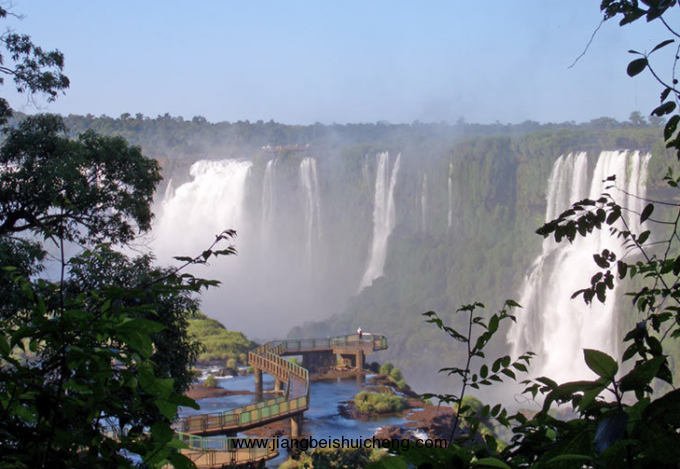 與阿根廷一樣,巴西也修了路徑,讓游客沿路觀看瀑布。不同的是,阿根廷那邊是路在瀑布里,而巴西這邊為路在瀑布外,離開瀑布一段距離,只能面對著60-80米高的“條條黃河”般的瀑布。