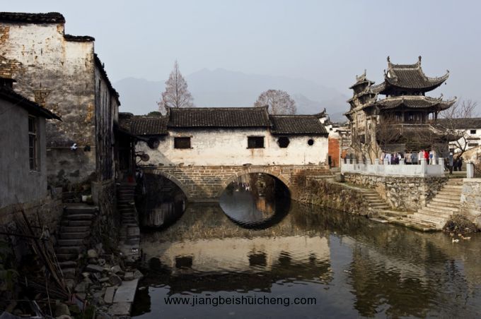 古鎮許村歷史上是徽州通往安慶、池州的必經之地。許村古村落的形成有1500多年的歷史,至今留存著元、明、清建筑200余處,其中有石牌坊8座,磚門坊3座、亭閣1座,廊橋1座,石拱橋2座,祠堂古民居多處,其中雙洞高陽廊橋是元代許友山所建,風格別致,彩畫迷人;明代五馬坊、雙壽承恩坊雕有飛禽走獸,栩栩如生;明代的大觀亭為省級重點文保單位,亭的一二層樓板、大梁上繪有“雙龍戲珠”等清晰的圖案,底層四壁還有“八卦圖”,在眾多的明清古民居內,如許世達宅、許本智宅等,都有精美的磚雕、木雕和古家具,在昉溪橋邊還有一巨大磐石迎河而立,名為“任公釣臺”,據查這是南朝文學家任昉隱居許村垂釣石上而得名。