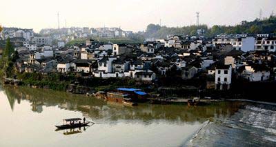 站在石壩上,舉首四望,氣象萬千,盡收眼底。壩上碧波如鏡,魚翔深潭,小舟撥浪,激起漣漪,恬靜安閑。壩下亂石嶙峋,浪峰咬石;西岸巍然屹立的紫陽山,林木蔥郁;建于明代的紫陽橋,宛若彩虹橫臥清波,此橋長140米,高14米,寬10米,在歙縣城的三座古橋中最高、最寬,因橋的上游即為徽商行舟的碼頭,所以橋孔建得比一般橋要高大得多,以便行舟過帆。