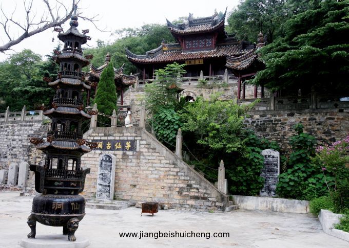 洞前建有兩層磚木結(jié)構的正殿一座,殿寬三間,飛檐翹角,額懸“茅仙古洞”四字木匾,殿旁建有六角涼亭;洞附近有大禹治水處、劉安瘃冉井、壽塘關等名勝古跡。