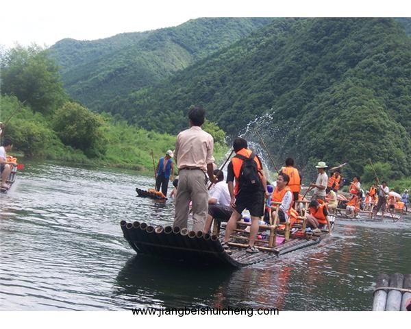 “江南第一漂”位于徽水河流經涇縣的最后一段,上起烏溪鄉姚村,下止黃村鄉,景區全長約20公里。景區內河道蜿蜒曲折,水流湍急,兩岸層巒疊翠風光綺麗,是休閑旅游的好去處。徽水河漂流途經五大景區:起筏地叫龍潭,灘長浪急,游人在竹筏上隨浪俯仰,跌宕穿梭,一種戰勝大自然的酣暢淋漓之感油然而生。接下來是“早霧山”景區。這里終日云霧繚繞,而水平浪穩,版權所有,山東聊城聊之旅國際旅行社有限公司,轉載必究!使游人跌宕之心轉而為柔情愜意。早霧山下端河道突轉急彎,形成“刁潭”,岸邊巨石上的“潭古印”,版權所有,山東聊城聊之旅國際旅行有限公司轉載必究!形象地記錄了昔日放筏工艱難的歲月。這里不知有多少放筏工誤落水中,而落水者卻浮而不沉,因而留下了“刁潭不刁”的神奇傳說。而“胡老灣沖浪”則更是一彎三折,灘中有垅、垅中有灘,千余米的河道落花流水差一米多,游人最能體現“兩岸猿聲啼不住,輕舟已過萬重山”的古詩意境。急灘甫過,柳暗花明又一村——溪西山到了,這里山高水秀,常有云霧繚繞,村舍依山俯傍水而筑,是道地的農家風光。沿流停筏,小扣柴扉,你能喝到頂級的綠茶“溪西山毛峰”。接下來便到了五雀嶺景區,這里有雞公石、馬影石、木魚墩、百畝草坪、高灘晚釣、斷橋綠水等景點,人稱“江南小漓江”。