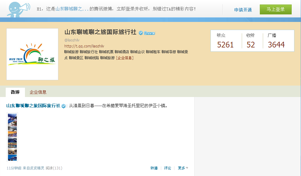 電話:0635-8333000 8336000 8339000 傳真:0635-8336665 地址:山東省聊城市東昌府區興華東路7號 郵編:252000 官方網站:www.ly888.cn 歡迎致電全國統一(免長途)熱線:400 0635 369 國內旅游請按1 國際旅游請按2 聊城旅游請按3 票務會議租車請按4 人工請按0 版權所有:Copyright(C) 劉寶平工作室_Mr.Liu Stu 聊城市旅游攝影協會 「我們」? 商會丨俱樂部丨實業公司 山東聊城聊之旅國際旅行社有限公司