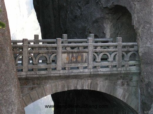 一座小小拱橋在兩座峭壁之間懸空而架,橋下是萬丈深淵,十分險峻而富有情趣。步仙橋將夢幻景區(qū)和天海、白云景區(qū)連接在一起,一頭通向黃山西大門釣橋庵,一頭可通天海。作為繞谷路線地標,是很多愛冒險的游客必到之處。
