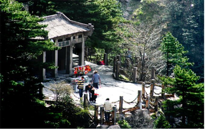 亭前有平臺(tái),約70平方米,臺(tái)前設(shè)有石欄鐵索,游客可以憑欄飽覽西海奇景。這里面對(duì)群峰大壑,視野開(kāi)闊,是觀賞黃山秀色最佳處之一。