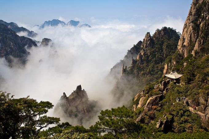 白云谷與西海排云亭一樣,最絕妙的是觀賞云與霞。觀霞當(dāng)在傍晚,以秋日和初冬的傍晚最佳,太陽(yáng)落山前后,云霞滿天,有淡紅的,有玫瑰紫的,有鮮紅的,或成線,或成片,或?qū)訉盈B疊,有時(shí)則變幻組合,色彩斑斕,如巧手織就的云錦,煞是喜人。大凡霞飛滿天,第二天十有八九是個(gè)好天氣,可讓你在黃山各處景點(diǎn)放心地暢游一番,遇到雨后初晴,風(fēng)起云涌,白云大峽谷如同一條吞云吐霧的巨龍,一團(tuán)團(tuán)、一簇簇的云朵如波濤翻滾、濁浪排空般地涌來(lái),除了沒有震耳欲聾的海嘯聲,幾如錢塘觀潮一樣壯闊,令人震撼。再有不同之處,是云海的千般變幻,一忽兒滾滾滔滔,一忽虛無(wú)縹緲,一忽兒薄紗遮蒙,一忽氣朗風(fēng)清,薄幕流云籠罩的峰、石、松若隱若現(xiàn),一動(dòng)一靜,形成了變幻莫測(cè)的迷人景象,讓人真如進(jìn)入神話般地夢(mèng)境。
