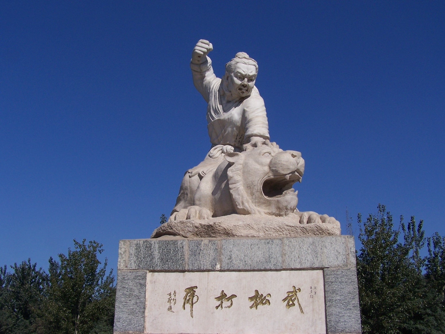 內容敘武松打死惡霸李家五虎,逃至柴進莊上。后因思念兄長,辭別柴進回家探親,途經景陽崗,在崗下酒店連喝十八碗好酒。武松欲離店過崗時,被酒家攔住,告知景陽崗上有猛虎傷人。武松不聽勸阻,執意過崗,乃至山神廟見到陽谷縣告示,方信真的有虎,決心打虎為民除害。來至山高林密處,酒勁上涌,睡倒青石板上。一聲虎嘯,武松驚起,見猛虎撲來,武松與虎展開搏斗,幾經周折,方將老虎摁住,踢打一陣,將虎制死。