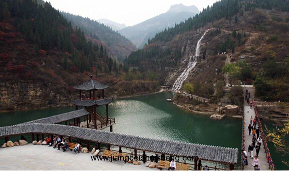 進入山門,景區2公里的引導區域可乘旅游觀光車游覽,沿途懸崖峭壁,怪石林立,崖壁之上,或如人面,或如牛首,千姿百態,惟妙惟肖。古松虬枝倒掛溪流兩岸,黃綠交融,相映成趣,青石小院點綴其間,構成了一幅神奇的天然畫卷。游人所到之處,仿佛走進了夢境,無不驚嘆大自然的神功鬼斧。觀光車的盡頭是景區小廣場,此處是游客休憩駐足之處,從這里出發景區的游覽才算是正式開始。錯落有致的三個形態迥異的瀑布吸引了游客的注意力,三合瀑、水簾瀑和歡喜瀑從懸崖峭壁上奔瀉而下的瀑水,猶如千軍萬馬,層層飛瀉,聲勢浩蕩。游客從水簾洞中穿過,頭上瀑布如雷鳴乍響,外面瀑布猶如水注,通過石壁水簾觀覽山中風景別有韻味。