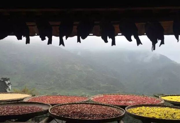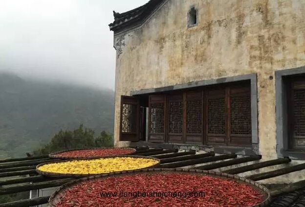 篁嶺古村數(shù)百棟徽派古民居在百米落差的坡面錯落有序,整個山間村落飽經(jīng)滄桑的徽式民居土磚外墻與曬架上、圓圓曬匾里五彩繽紛豐收果實組合,繪就出世界獨一無二的“曬秋”農(nóng)俗景觀、最美的鄉(xiāng)村符號。