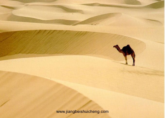 一只駱駝在沙漠里跋涉著。正午的太陽像一個大火球曬得它又餓又渴,焦躁萬分,一肚子火不知道該往哪兒發才好。