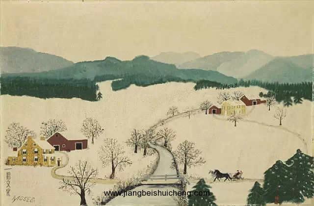有人問,你為什么在年老時選擇了繪畫,是認(rèn)為自己在畫畫方面有成功的可能嗎?我的生活圈從未離開過農(nóng)場,曾是個從未見過大世面的貧窮農(nóng)夫的女兒、農(nóng)場工人的妻子。在繪畫前,我以刺繡為主業(yè),后因關(guān)節(jié)炎不得不放棄刺繡,拿起畫筆開始繪畫。假如我不繪畫的話,興許我會養(yǎng)雞。