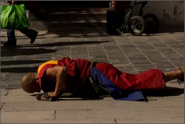 八廊街被藏族人稱為圣路,因此有許多磕長頭的佛教信徒活躍于此,許多信徒也愿意成為攝影師們的擺拍模特。