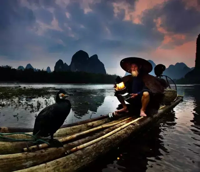 漓江漁民的工作分為早班和晚班,清晨,漁民們拿上道具——魚鷹和煤油燈,開始一天的工作。這里收費相對高昂,一百多一次,每次表演只有幾分鐘,所以攝影師們必須抓緊時間拍攝,錯過了好的時機,就只能再次付費,排隊等下面幾班人。