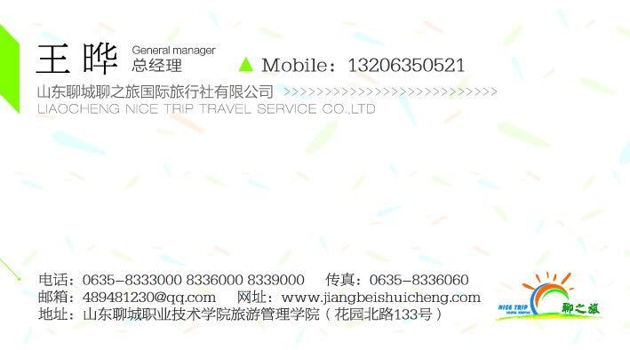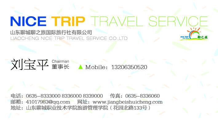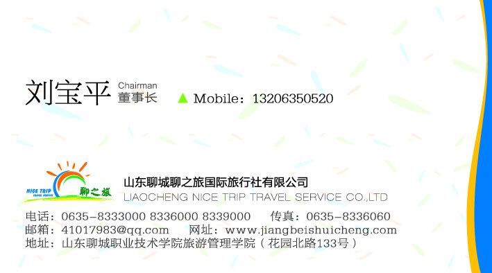 電話:0635-8333000 8336000 8339000 傳真:0635-8336665 地址:山東省聊城市東昌府區興華東路7號 郵編:252000 官方網站:www.ly888.cn 歡迎致電全國統一(免長途)熱線:400 0635 369 國內旅游請按1 國際旅游請按2 聊城旅游請按3 票務會議租車請按4 人工請按0 版權所有:Copyright(C) 劉寶平工作室_Mr.Liu Stu 聊城市旅游攝影協會 「我們」? 商會丨俱樂部丨實業公司 山東聊城聊之旅國際旅行社有限公司