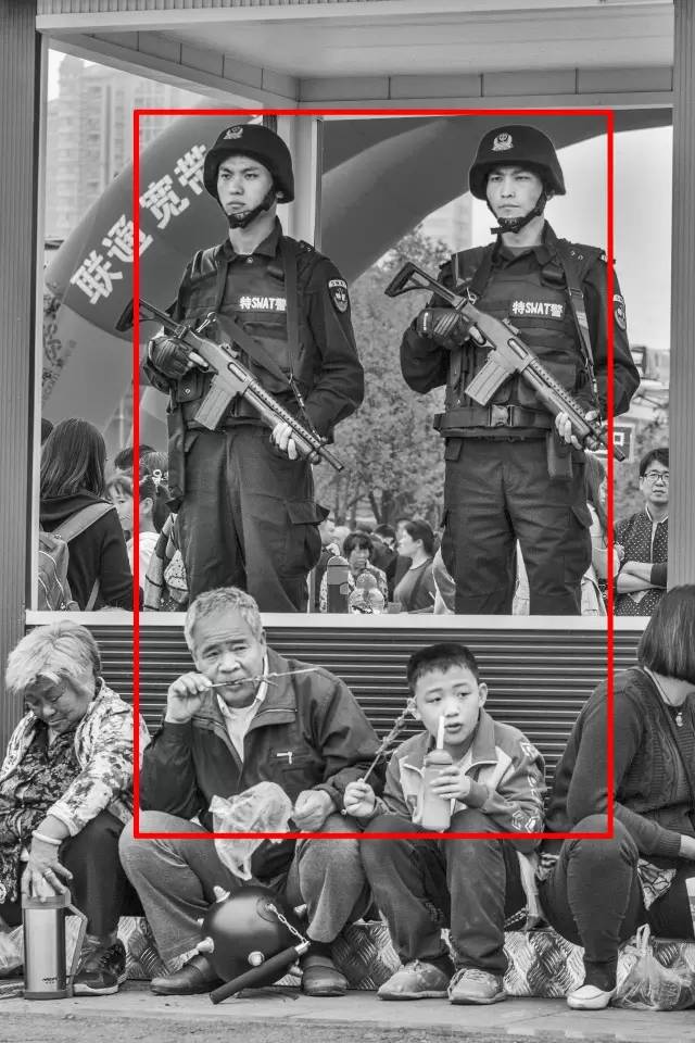 點評:特警的堅守,百姓在警察的身邊安詳生活,表達的主題很好。不過,左邊警察頭部與廣告語重疊,影響視覺中心,拍攝時應注意隱蔽掉廣告。