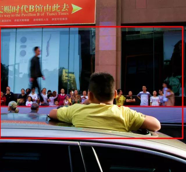 點評:T臺表演者的虛化,靜止清晰的男孩,慢速拍攝能更好地表現(xiàn)虛實、動靜的對比。但是,作者采取正方形的構(gòu)圖不妥,左上角的紅色廣告牌有些搶戲,下部的車窗影響視線。剪裁后,畫面更簡潔明了。