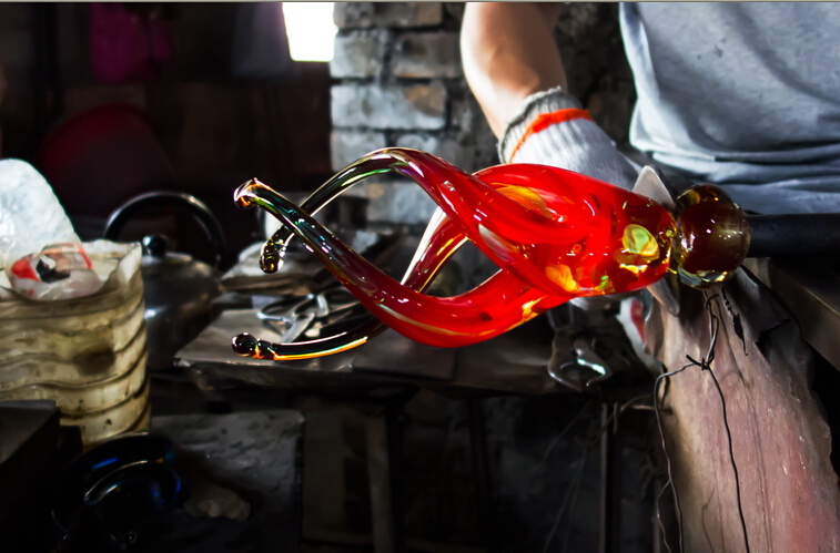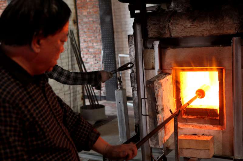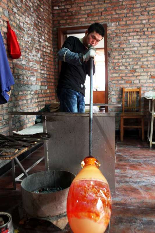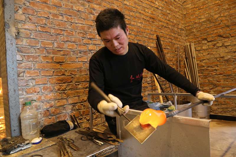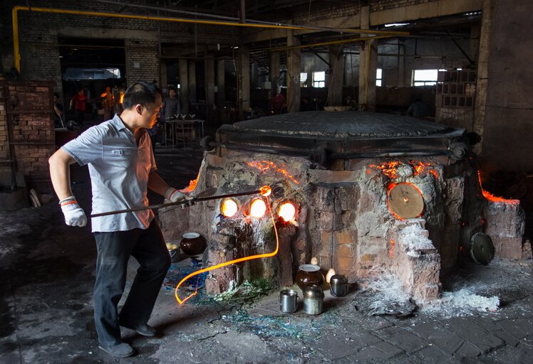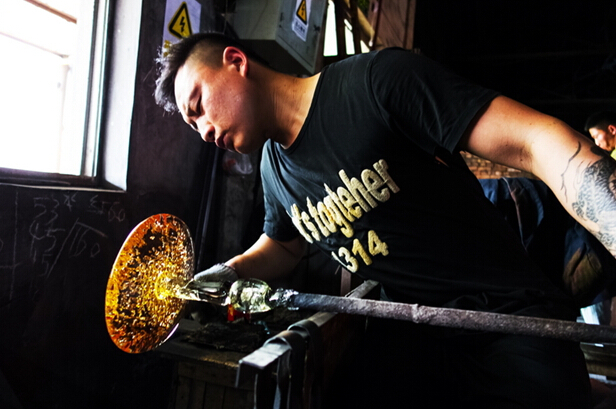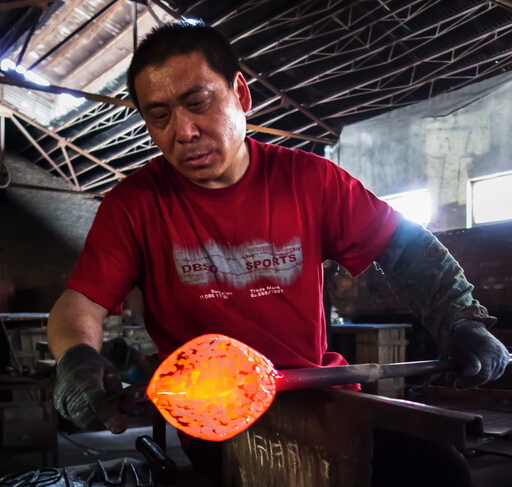 全程拍攝大爐琉璃制作,博山是琉璃之鄉(xiāng),保留傳承了琉璃加工的傳統(tǒng)技藝,并在此基礎(chǔ)上又自己的開拓創(chuàng)新。琉璃的制作工藝相當(dāng)復(fù)雜,火里來、水里去,要幾十道工序才能完成,古法琉璃的精品制作,相當(dāng)費(fèi)時(shí),有的光制作過程就要十幾二十天,而且主要依靠手工制作。八卦爐,爐里的溫度在1400-1600度,工作車間內(nèi)的溫度能達(dá)到50攝氏度左右。還有傳說琉璃是一個(gè)叫路申的博山人在用八卦爐煉丹的時(shí)候偶然發(fā)現(xiàn)的,觀其在經(jīng)過烈火煅燒之后還可以晶瑩剔透,遂以長生不老之丹為名進(jìn)獻(xiàn)給當(dāng)時(shí)的國君,并置于朝堂以消滅災(zāi)禍。所以佩戴琉璃小飾品還有去災(zāi)避禍的用處。大師提取原料吹制的過程,都是大師們用空心的管根據(jù)顏色的需要從爐口中提取,然后用空心管吹制。在吹制的過程中,溫度就會(huì)下降,然后再上回溫爐進(jìn)行加工。