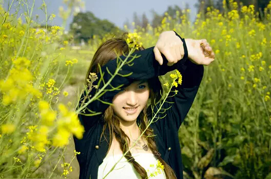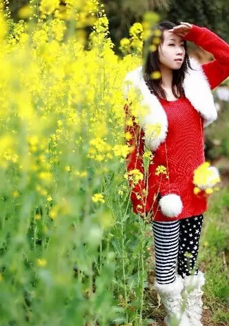 油菜花屬于清新系列的色調(diào),搭配的服裝,顏色一定選擇淺色系的,千萬不要想著去和花爭艷,穿個大紅大紫的。
