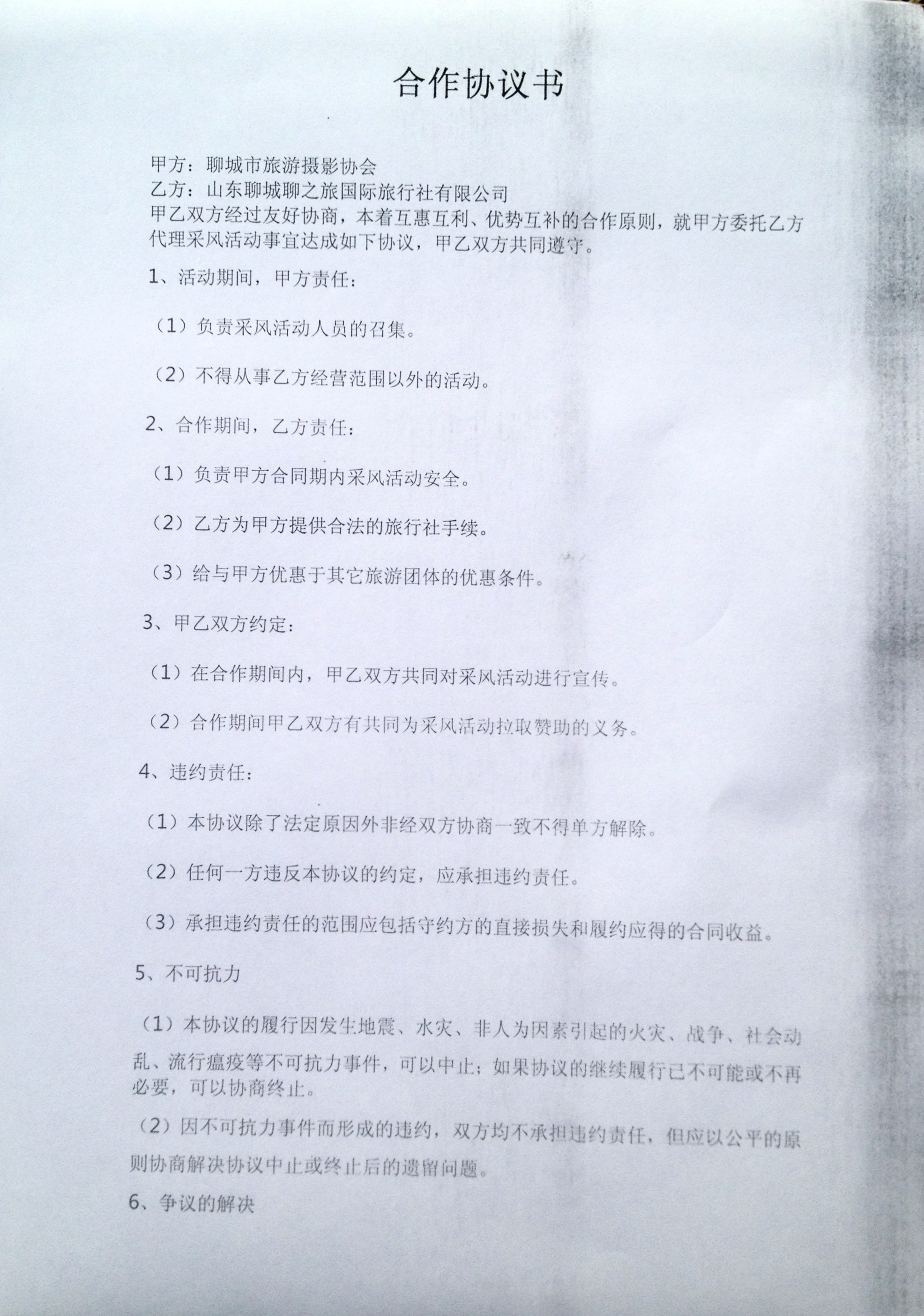 為響應國家政策號召,聊城市旅游攝影協(xié)會委托我公司代理采風活動事宜,雙方經(jīng)過友好協(xié)商,本著互惠互利、優(yōu)勢互補的合作原則,達成以下協(xié)議。
