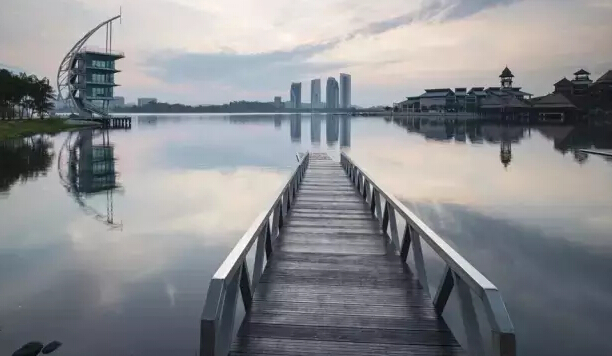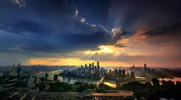 遠景是日落的晚霞五彩斑斕十分漂亮
