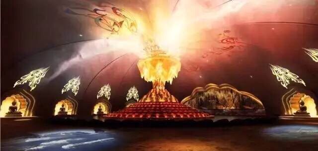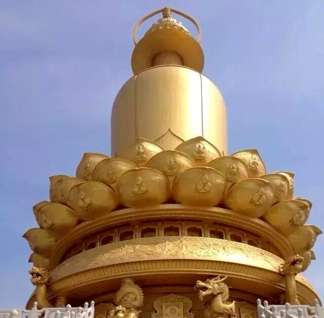 山東省濟寧市兗州區興隆文化園(大興隆寺)景區內,有一座宏偉的靈魂中心建筑——高達118米的靈光寶殿,共分九層。上部金瓶聳然矗立在金蓮花須彌臺上,氣勢雄偉、莊嚴神圣,其中安奉著興隆塔地宮出土的世尊金頂骨真身舍利;下部借鑒了釋迦牟尼壇城的形制,氣勢磅礴象征佛祖的智慧浩瀚無邊與獨特深厚的佛教壇城理念交相輝映。