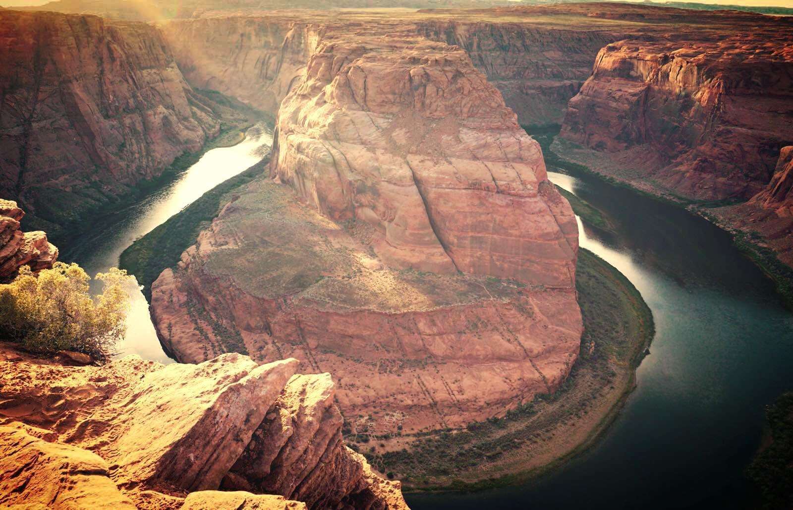 馬蹄灣(Horseshoe Bend)是科羅拉多河在亞利桑那州境內的一截U形河道,也是格蘭峽谷其中一小段,由于河灣環繞的巨巖形似馬蹄,故名“馬蹄灣”。也有人叫它科羅拉多河的Ω大拐彎,河水是誘人的深綠色,映著紅山,真是壯觀的美。晚上入住酒店休息。