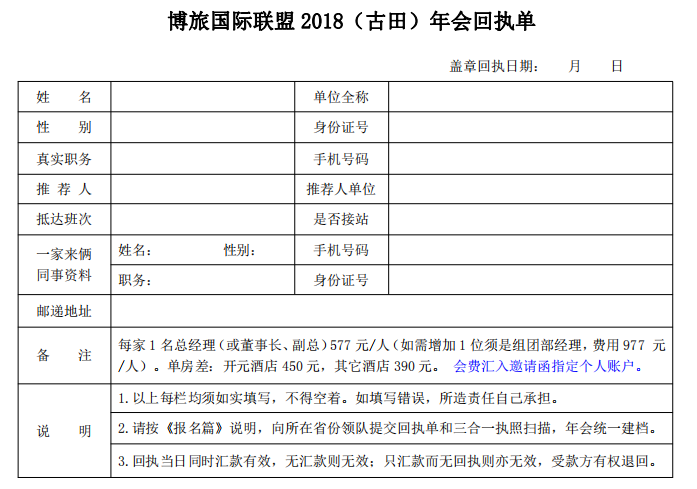 3、參會單位須如實填報《博旅國際聯盟 2018 年會回執單》,連同年會匯款回單截圖按指定發送確認(下詳)。