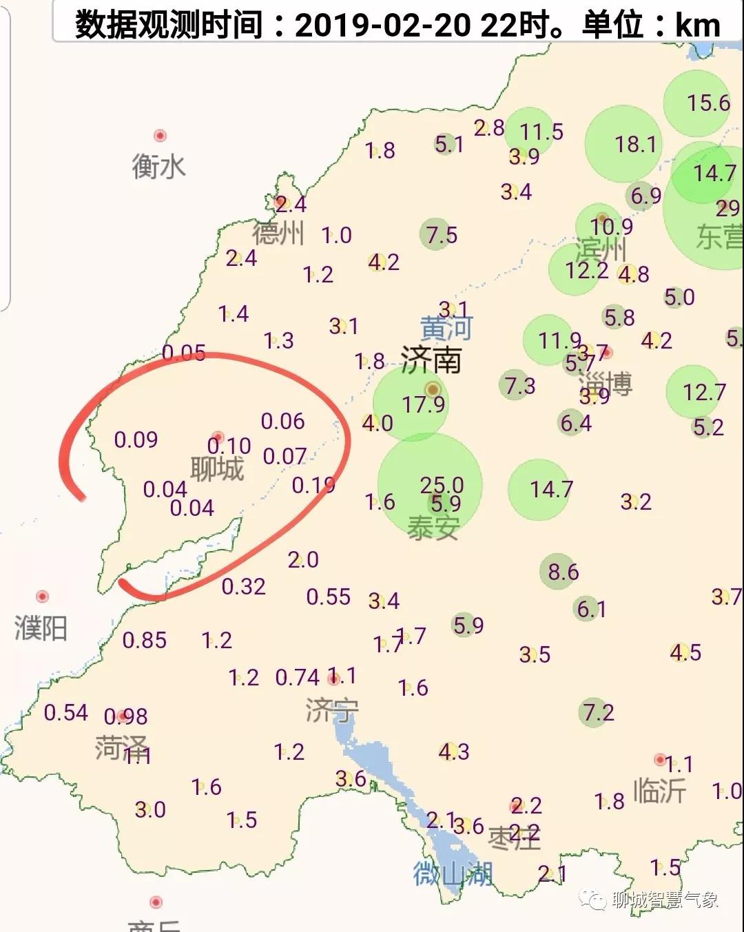 圖三:20日22時能見度數據顯示:我市能見度當前為全省最低