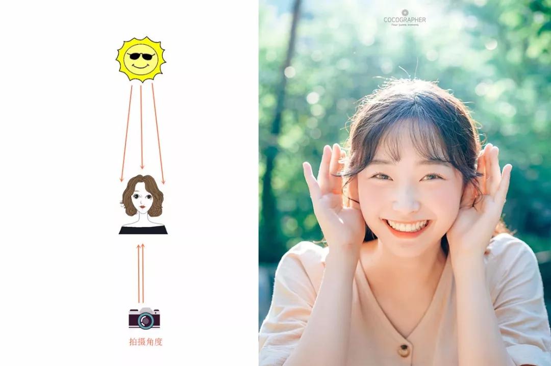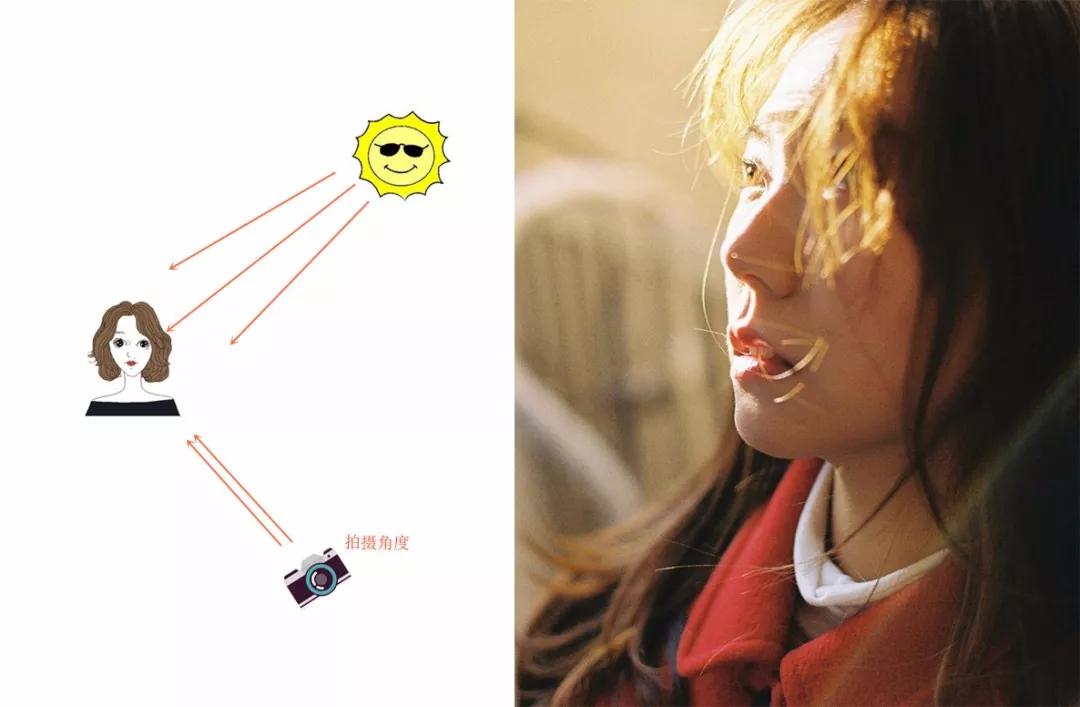 上面講的是逆光拍攝,還有一種是側逆光拍攝,當太陽光線處在模特左邊或者右邊,就是側逆光。