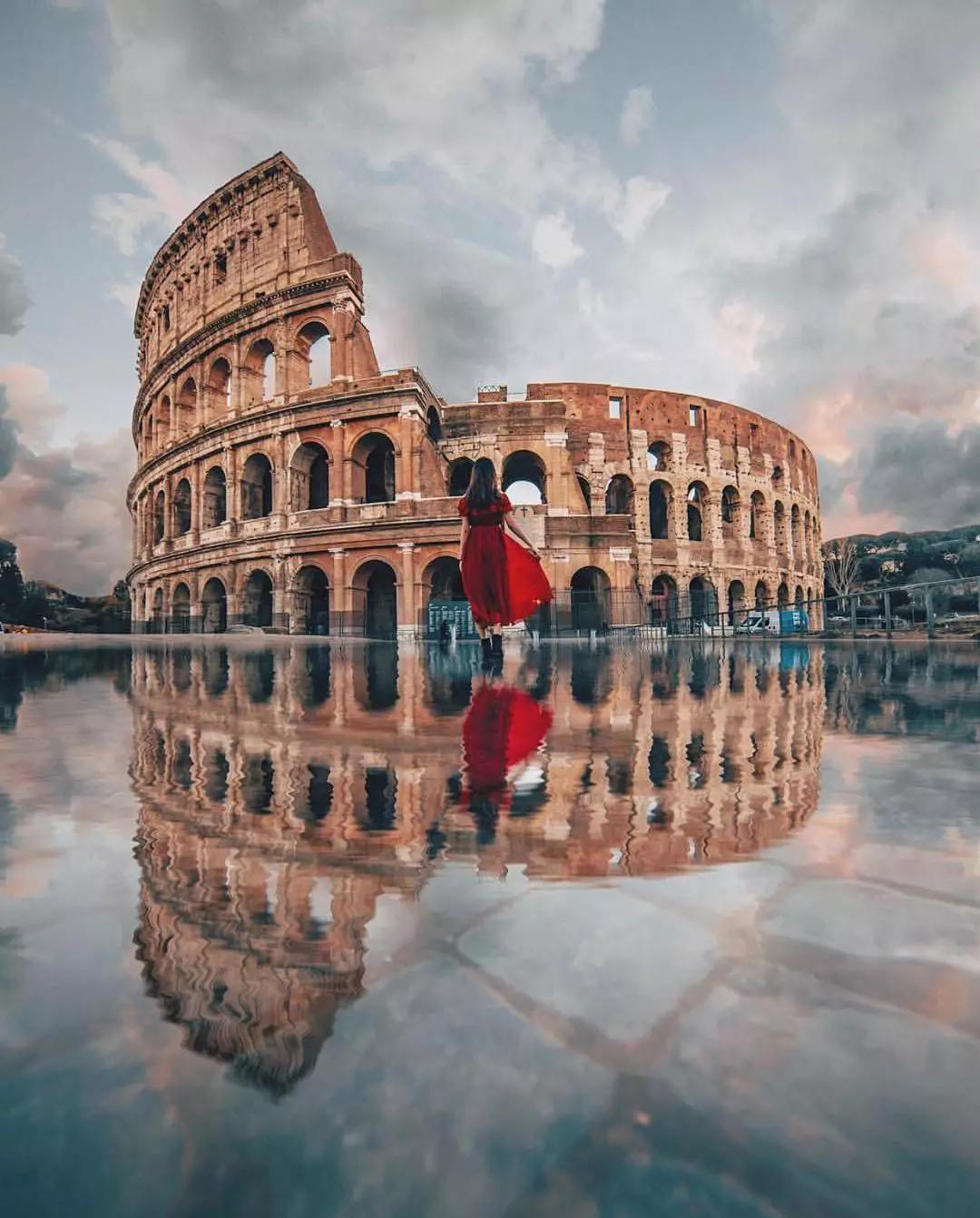 龐大的羅馬斗獸場與穿著一席紅裙的少女相融合,散發出一種古羅馬的人文氣息,水中的倒影又給畫面增添了一絲絲神秘夢幻感。