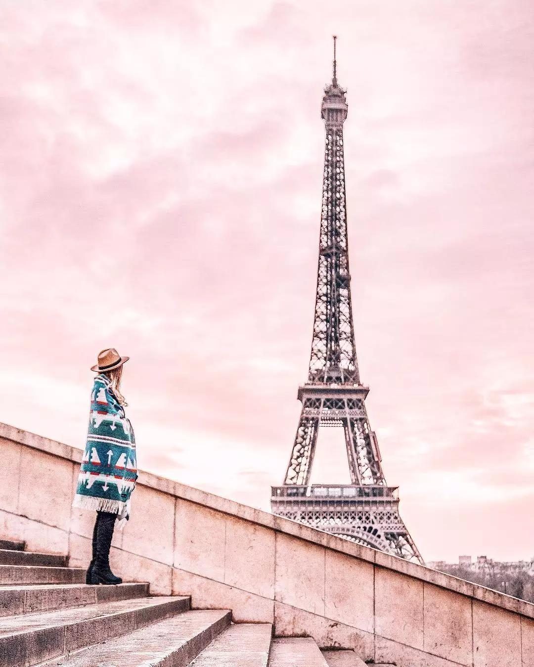 巴黎鐵塔邊的女孩,畫面以粉色調為主,洋溢著濃濃的浪漫主義風情。